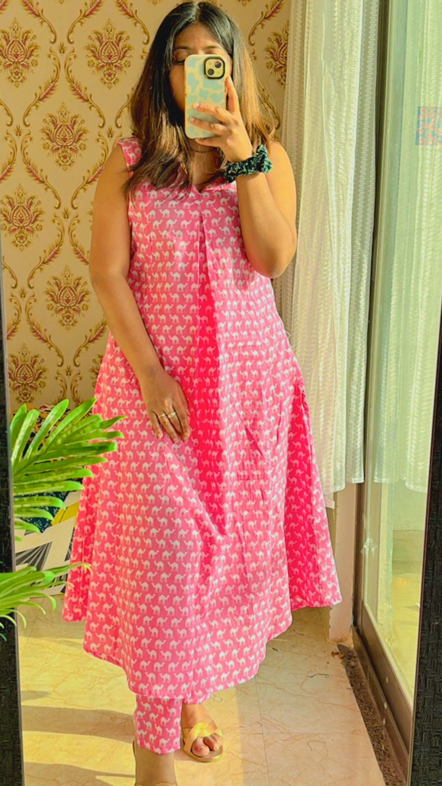 Introducing our vibrant Carrot Red Camel Caravan Cotton Kurta Pants Set, where bold hues meet whimsical charm! The kurta features a striking carrot red base adorned with adorable white camel prints, adding a playful touch to your ensemble. Its sleeveless design and chic V-neckline exude contemporary elegance, while the A-line pattern ensures a flattering silhouette that flows gracefully.
