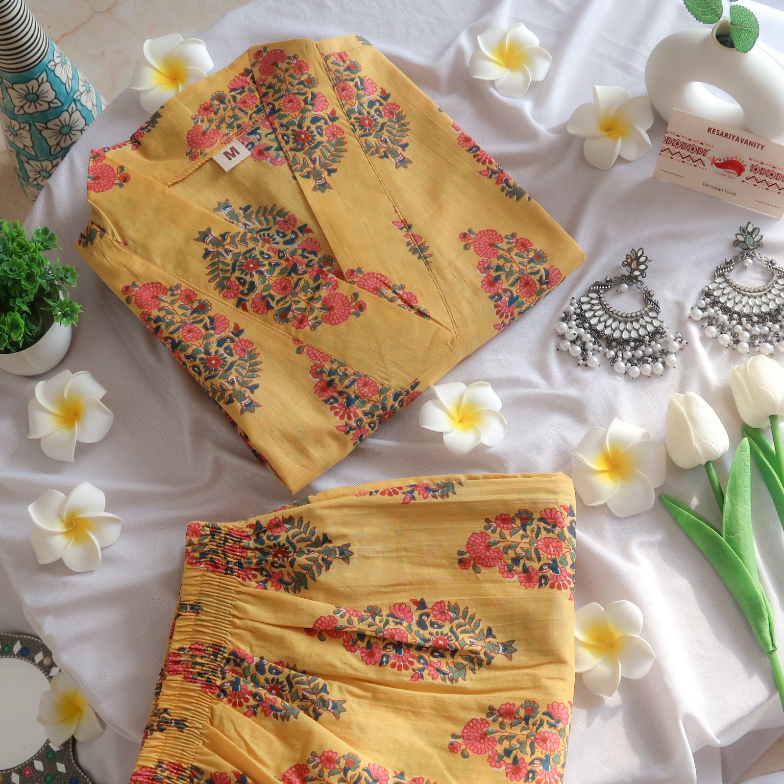 Completing the ensemble are the matching mustard light yellow pants, adorned with the same charming flower prints. These pants offer both style and ease, creating a harmonious and balanced look when paired with the kurta.