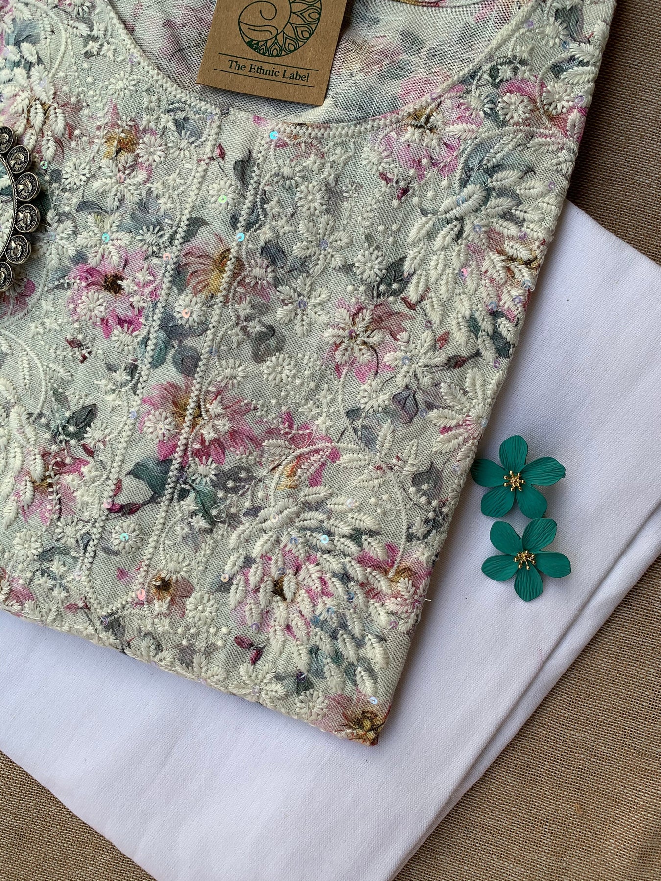 Festive delight, this kurta set is designed for all the days you want to keep things special and festive. This kurta set is a piece of art. The kurta comes with chikankari hand embroidery in the yolk .The soothing cotton fabric is the show winner. The set contains kurta and pants