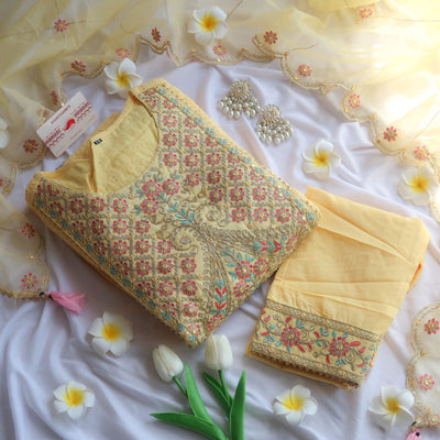 Introducing the "Golden Glow Ensemble" – a resplendent 3-piece suit set that bathes you in the radiance of bright yellow, elegantly adorned with Shiffali machine work embroidery and intricate detailing.