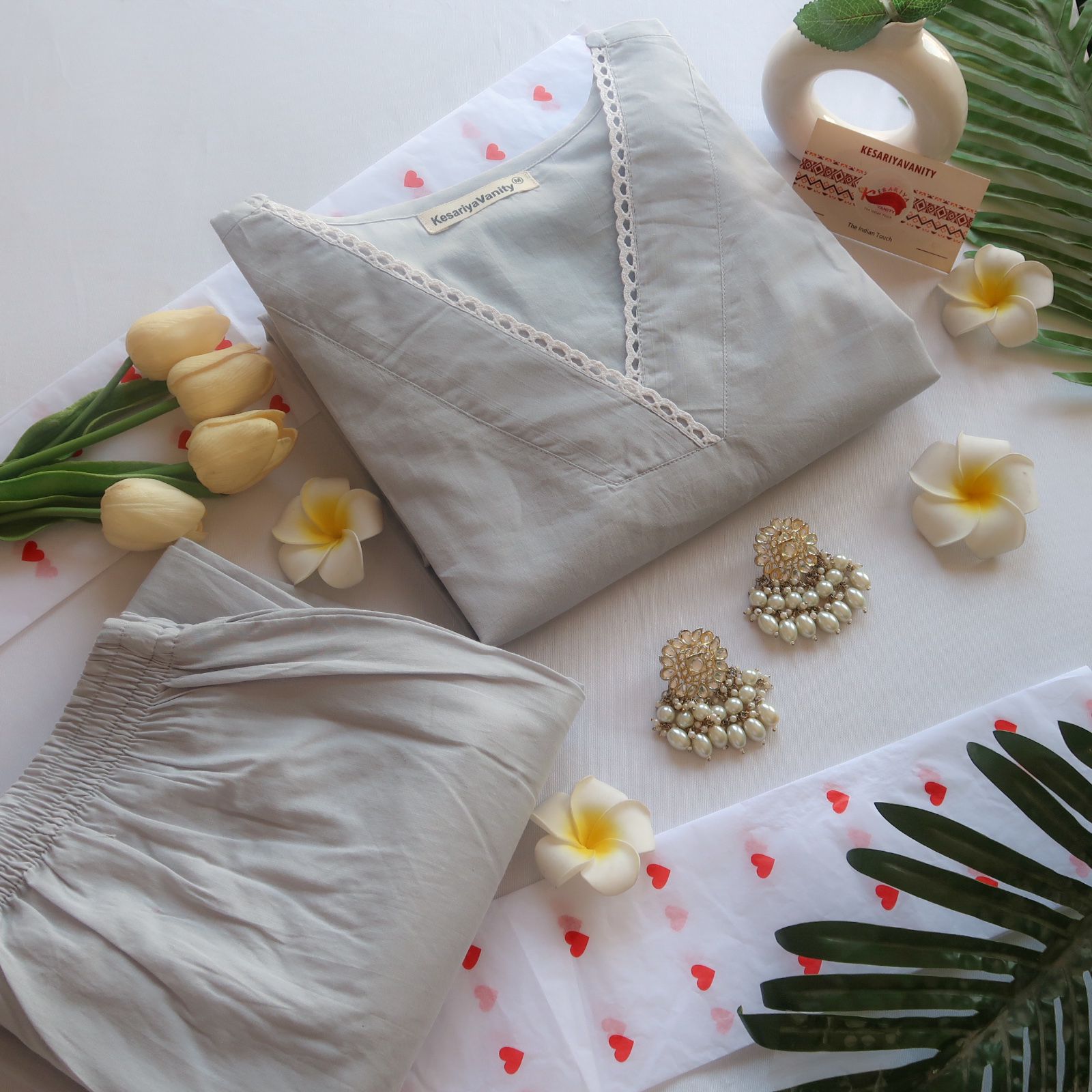 Redefine elegance with this pure cotton straight kurta pants set, perfect for understated sophistication. The kurta, in a soothing pastel light grey shade, is designed to exude effortless charm. Its V-neckline, adorned with intricate white lace detailing, adds a touch of delicate femininity, while the 3/4th sleeves offer a balance of style and comfort.