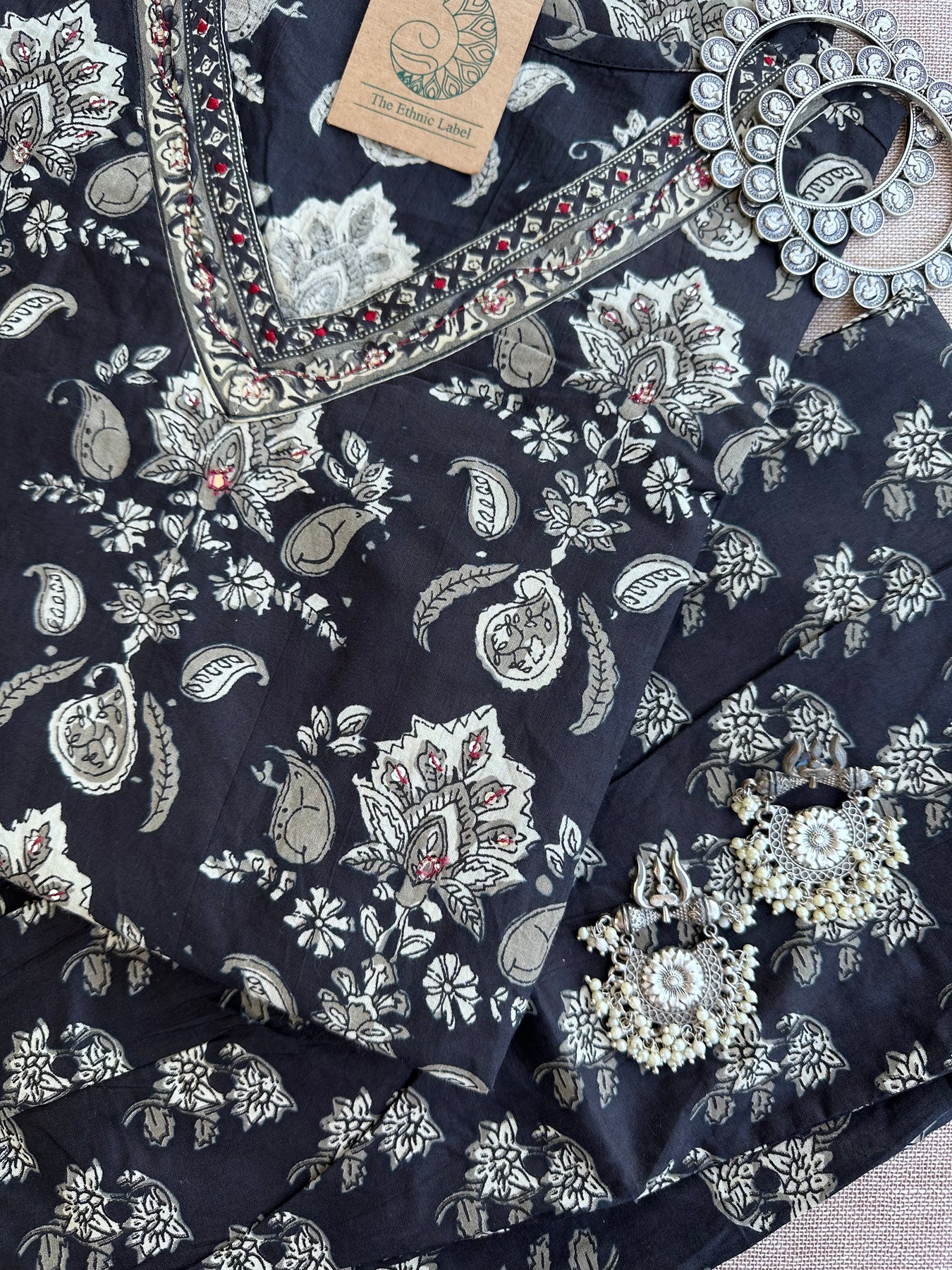 Festive delight, this kurta set is designed for all the days you want to keep things special and festive. This kurta set is a piece of art. The kurta comes with embellished neckline and sequin work on cotton fabric. The set contains kurta, afghan pants and dupatta.