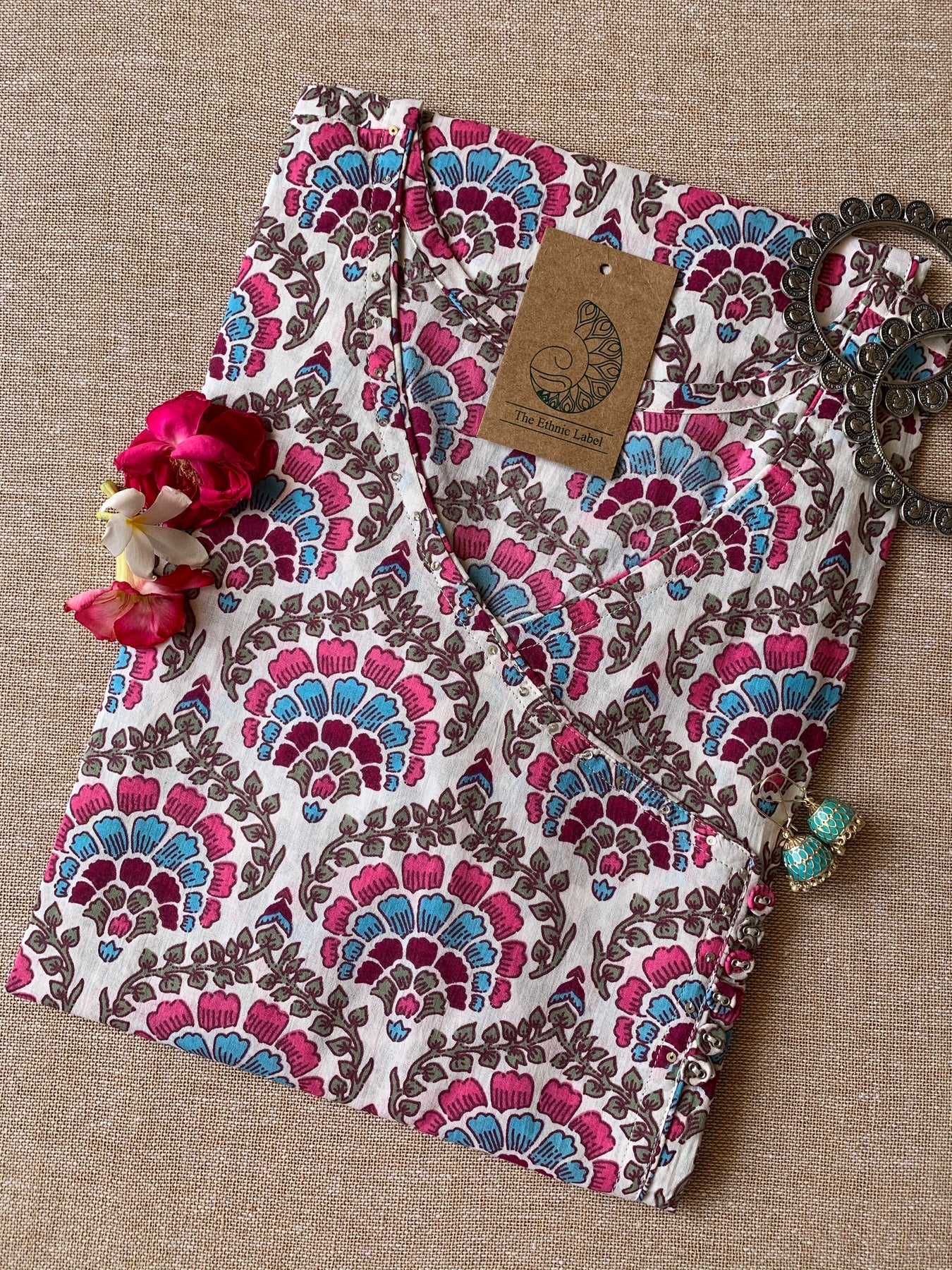 "Orchid" Blue Pink Angrakha Cotton Kurta - M