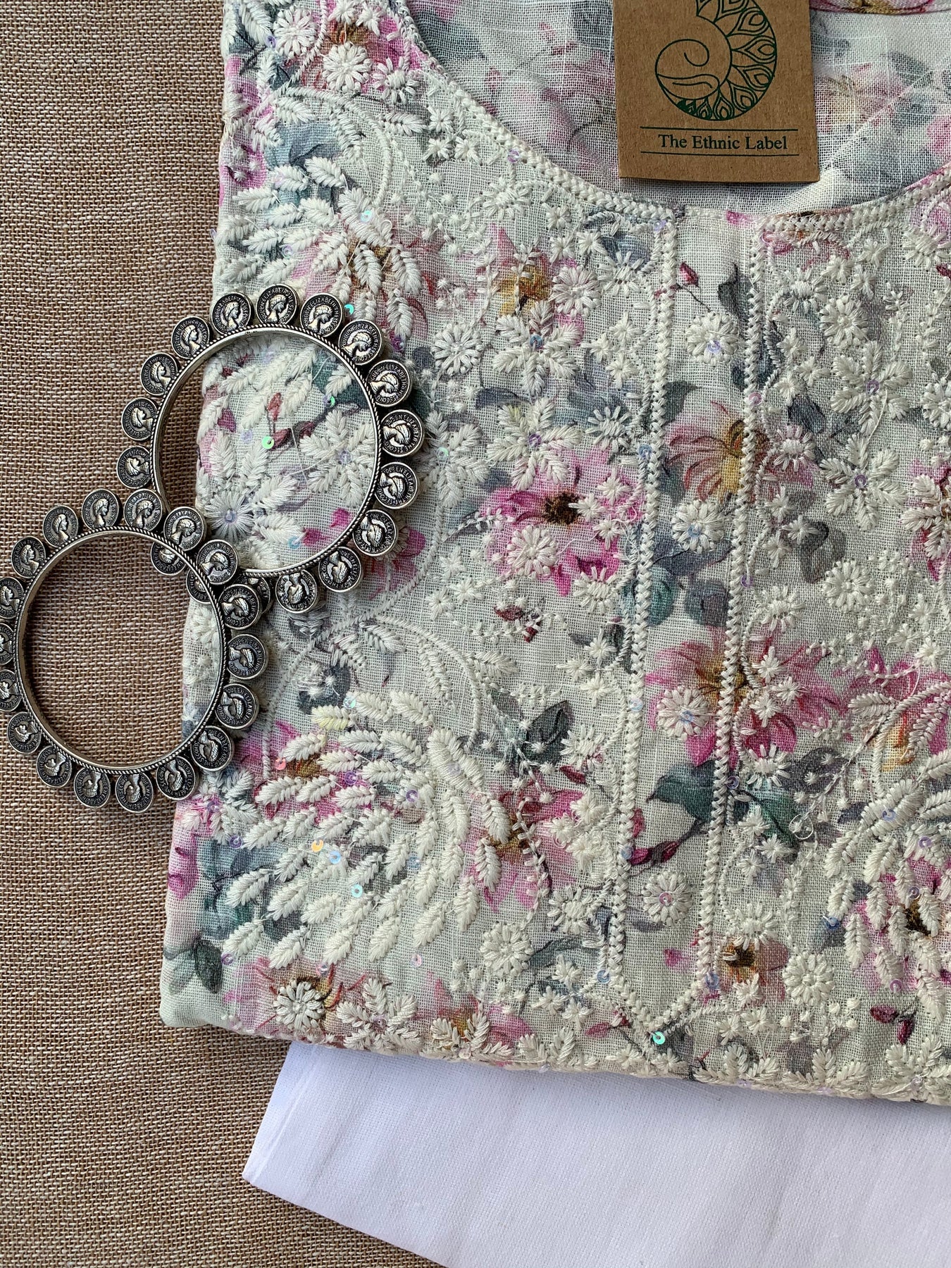 Festive delight, this kurta set is designed for all the days you want to keep things special and festive. This kurta set is a piece of art. The kurta comes with chikankari hand embroidery in the yolk .The soothing cotton fabric is the show winner. The set contains kurta and pants