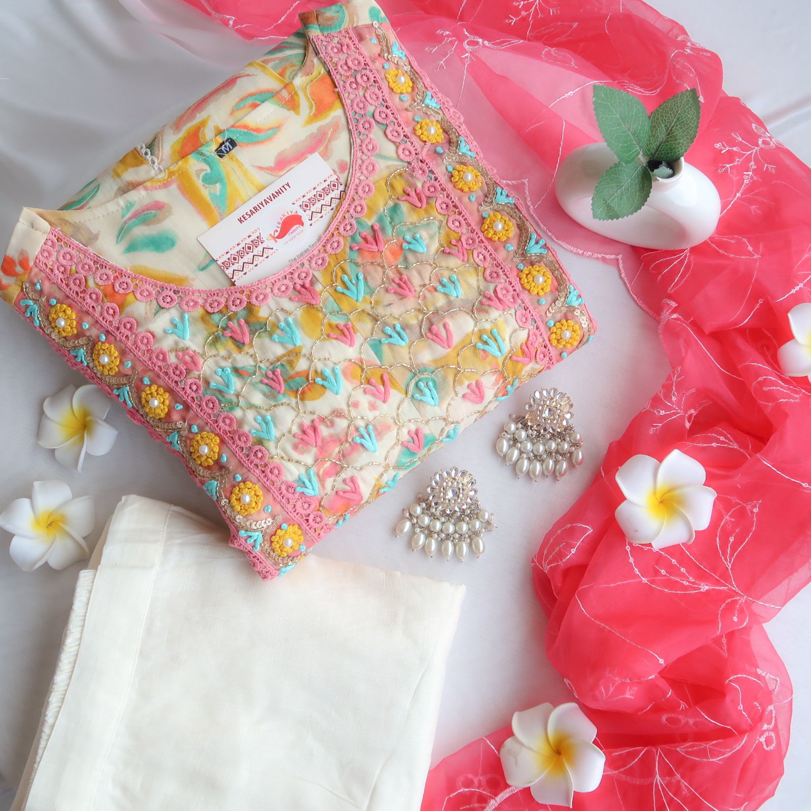 Introducing our vibrant Three-Piece Anarkali Suit Setq in a stunning multicolor pastel base, perfect for those who love to blend tradition with modern hues. The Anarkali kurta features a round neck and 3/4 sleeves, adorned with intricate and heavy embroidery throughout, making it a true statement piece.